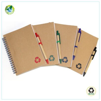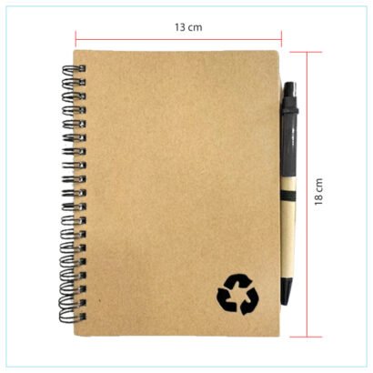 NOTEBOOK ECO FRIENDLY These natural colour Notebooks feature a die-cut environment friendly for a clean surrounding, Notebook includes a matching ball pen ruled paper and an additional sheet of sticky notes. Product Size : 180 x 141x 15 mm Printing Options : Screen Print.