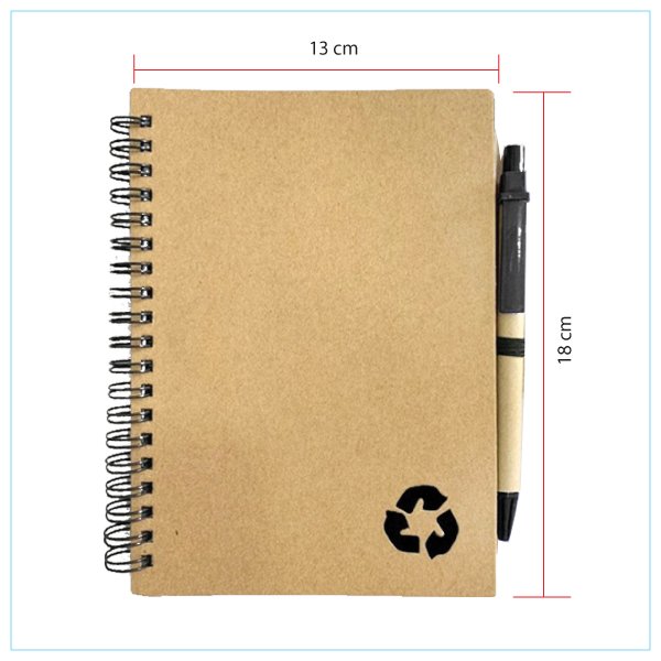 NOTEBOOK ECO FRIENDLY These natural color Notebooks feature a die-cut environment friendly for a clean surroundings, The Notebook includes a matching ball pen ruled paper and an additional sheet of sticky notes. Product Size : 180 x 141x 15 mm Printing Options: Screen Print.