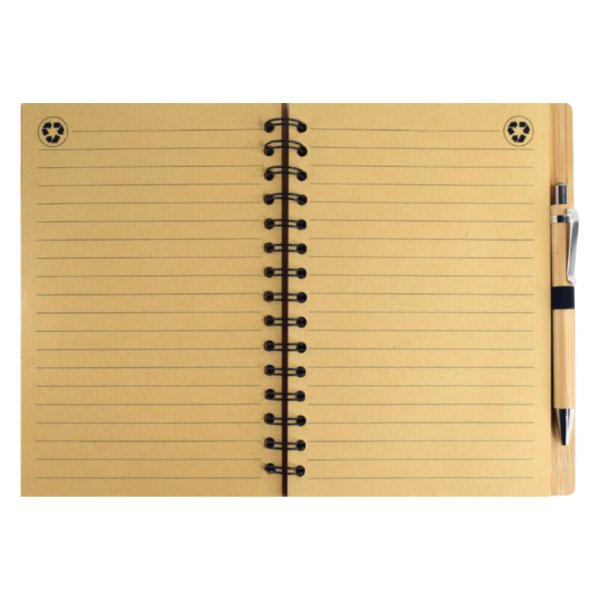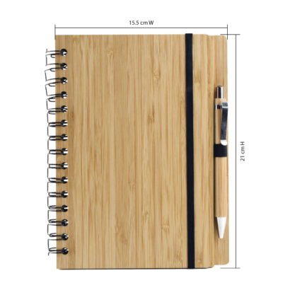 NOTEBOOK ECO FRIENDLY Natural Bamboo Cover Notebook with Pen lined paper with recycled individual can be personalized with company name thru print or engraving Product Size : 155x 210×20 mm Printing Options : Screen Print, Engraving