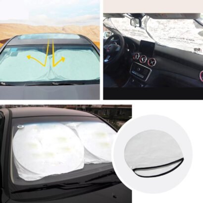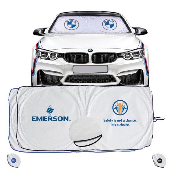 CAR SUNSHADE Material: Tyvek, White with black boarder, White with blue boarder Flat Size : 150 x 70cm | Circle Diameter : 61cm / 24″ Printing Option: Screen Printing