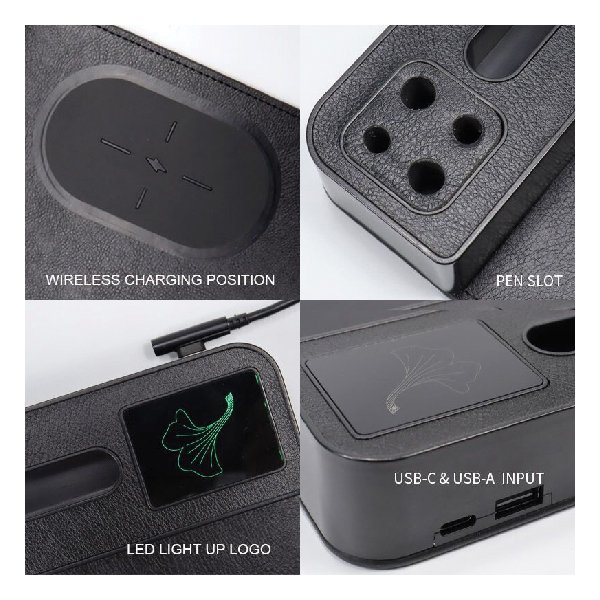 LIGHT-UP LOGO WIRELESS CHARGING MOUSE PAD Input: DC5V 2.1A(max.) (Type C) Output: DC5V 2.1A(max.) (USB Port) Wireless Power : 10W Transmission Distance : ≤ 6mm Charging Efficiency : ≥ 75% Execution Standard : Q1 1.1 Work Environment : -10°C ~ 50°C Logo Area : 3.4 cm W X 2.5 cm H Product Size: 25 cm H X 27.5 cm W Printing Option : Engraving, Debossing
