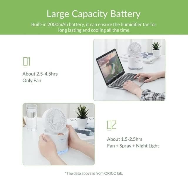 A FAN WITH THREE FUNCTIONS: misting fan, desktop fan, and breathing light. It is an ideal product for summer. It is also an essential product for humidification in winter. Spray and blowing can be used at the same time, or it can be a single function of blowing only and spraying only. MIST FUNCTION: In addition to the powerful blowing function, a mist function for rapid cooling is also added, which can be cooled immediately within 1 second. The spray fan has a built-in 300ml water tank. When you put tap water in the water tank and press the spray button, the delicate cool mist will be released in 1 second. It makes you feel cool and comfortable and keeps the surrounding air moist. USE DESKTOP FAN WHEN CHARGING: When the small fan is connected to USB, you can use the fan while charging, which is very suitable for use in the office. The built-in 2000mAh battery, when fully charged, can have 3-5 hours of battery life. The product body is made of high-quality ABS resin, has the characteristics of impact resistance and high temperature, and has excellent durability. 2 LEVELS SPRAY AND 3 LEVELS FANS ADJUSTABLE: the fan air volume can be adjusted from the medium. The spray level 2 can also be adjusted. While maintaining a strong air volume, it can also create an ultra-quiet environment. You don’t have to worry about disturbing you while sleeping or working. In addition, it is also equipped with a breathing light, LED light source that is easy for the eyes to see, so you can enjoy the warm and illuminating atmosphere.
